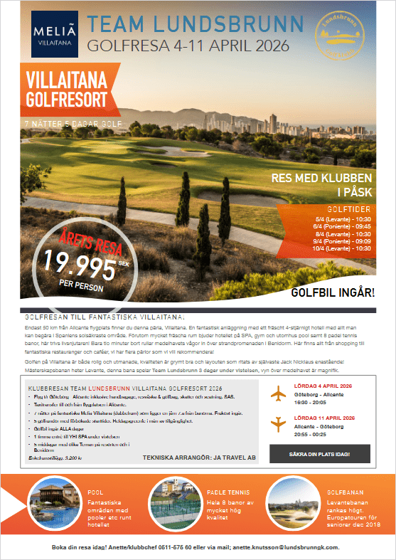 ENDAST 3 PLATSER KVAR – Vårens klubbresa går till……VILLAITANA! 4-11 April